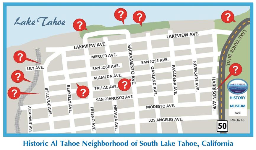 Scattered about historic AI Tahoe are blue, turquoise, and white signs. Find all ten of the signs and write their location site number next to the site clue below. Some site numbers are near private property. Please respect the owner's privacy. If you are driving, make sure to park your car legally off the road. The location site numbers are # WA-1 and # AT-1 through # AT-9.